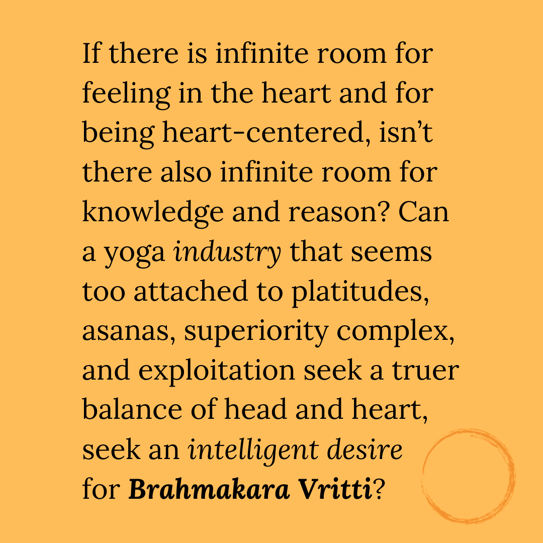 Meditating on Brahman, a Jnana yogi might ask: “If there is infinite room for feeling in the heart and for being heart-centered, isn’t there also infinite room for knowledge and reason? Can a yoga industry that seems too attached to platitudes, asanas, superiority complexes, and exploitation seek a truer balance of head and heart, seek an intelligent desire for Bramakara Vritti?”
