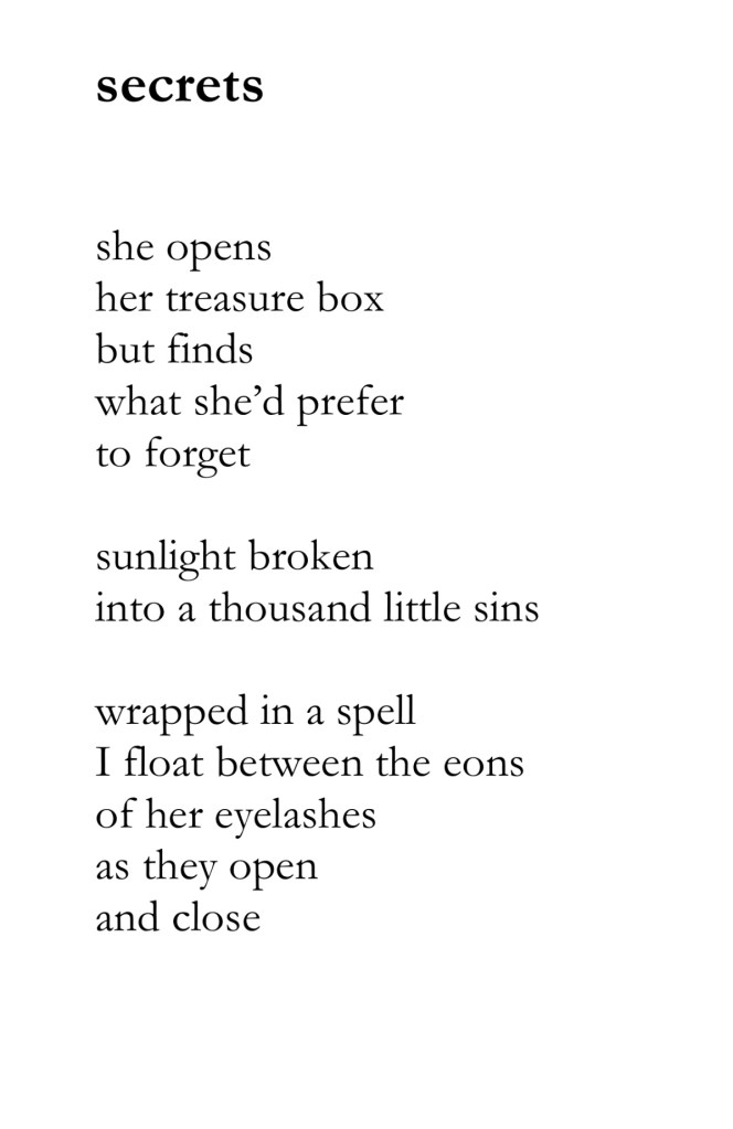 This particular poem welcomes the reader to witness a moment where the she of the poem confronts a secret she has been keeping from herself. She realizes an ugly truth, an inner truth that she had tried to ignore or suppress; yet, she had also stored it away in her treasure box. What a provocative juxtaposition! Then, an image arises in a simple phrase that hints at mischief, but it’s the sound of the words that is more important than their meaning: “sunlight broken / into a thousand little sins.” Then, the best part of the poem, is that the speaker, the I, the narrator of the poem, is but an invisible speck, some kind of micro-organism, somehow bewitched and floating “between the eons of her eyelashes.” This is an incredible shift in perspective. As a reader proceeding through a few short phrases, I have even forgotten to wonder what is the secret in the treasure box because I am now enraptured by the wonder about myself as dwelling between the eons of her eyelashes, contemplating myself as a floating micro-organism. Whoever “she” is in this poem, she is of goddess dimensions, and I am filled with awe.
